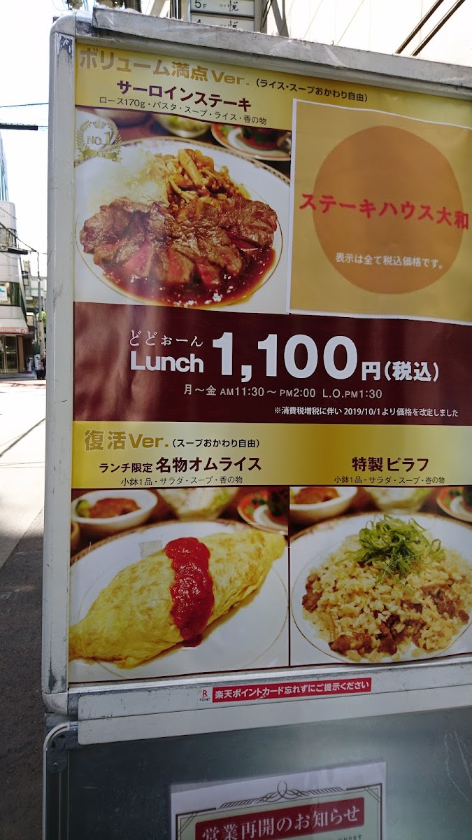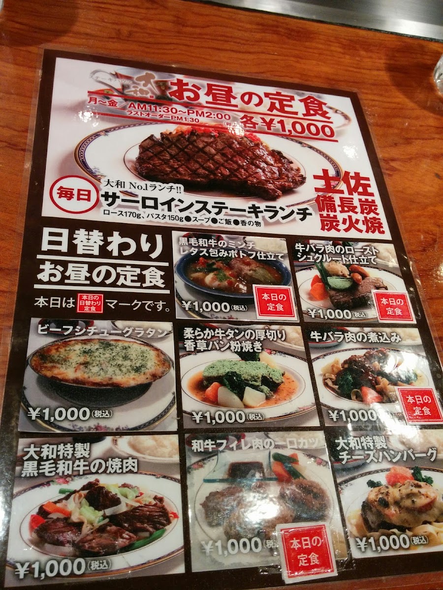 Yamato Steak House offers a diverse and tempting menu that brings together traditional flavors with a touch of innovation. Their サーロインステーキランチ is a standout, offering a hearty and flavorful steak experience that is perfect for lunch. Another must-try dish is the 仔牛の鉄板焼, a sizzling hotplate of tender veal that’s expertly cooked, allowing the natural flavors to shine through. For those craving a lighter meal, the オムライス 中 provides a comforting balance of fluffy omelette and savory rice, making it a satisfying choice. The restaurant’s menu also features a variety of other grilled meats, seafood, and side dishes, ensuring that there’s something for everyone to enjoy. Whether you’re in the mood for a rich, meaty steak or a comforting plate of omelette rice, Yamato Steak House delivers quality and delicious options that will leave you satisfied.
